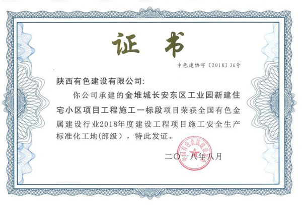 近日,從中國有色金屬建設協會傳來喜訊,公司金堆城長安東區項目榮獲“全國有色金屬建設行業2018年度建設工程項目施工安全生產標準化工地”稱號,這是公司獲得的首個中國有色金屬行業部級安全生產標準化工地,也是該項目繼獲得西安市航天基地2017年度“安全生產工作先進單位”后又一項安全管理工作殊榮。